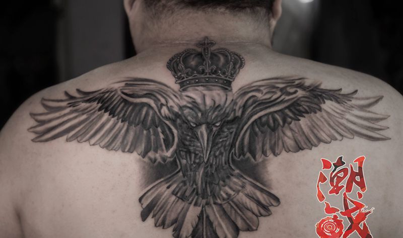 当前位置: 首页 >上海市纹身店-上海纹身潮战TATTOO纹身图案>纹身遮盖纹身图片_背部欧美写实老鹰遮盖纹身图案