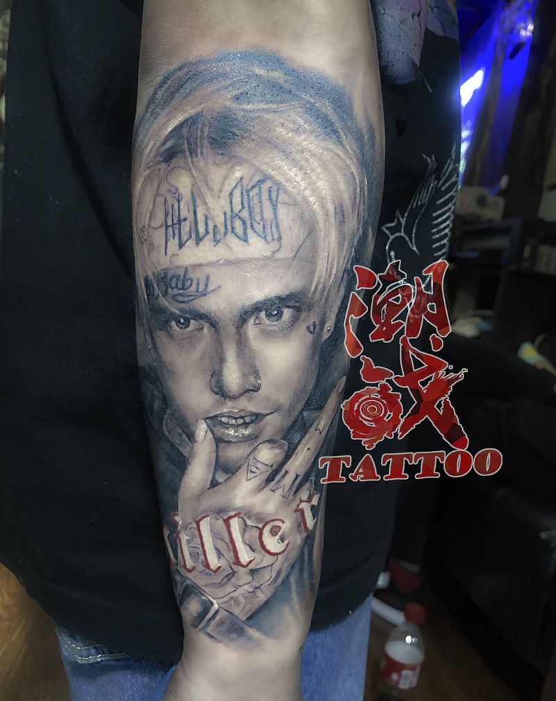 当前位置: 首页 >上海市纹身店-上海纹身潮战TATTOO纹身图案>Lilpeep纹身图片_手臂欧美写实花体字人像纹身图案