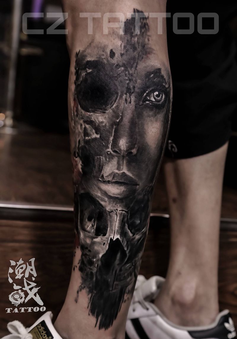 当前位置: 首页 >上海市纹身店-上海纹身潮战TATTOO纹身图案>暗黑酷女郎纹身图片_腿部欧美写实金属暗黑骷髅纹身图案