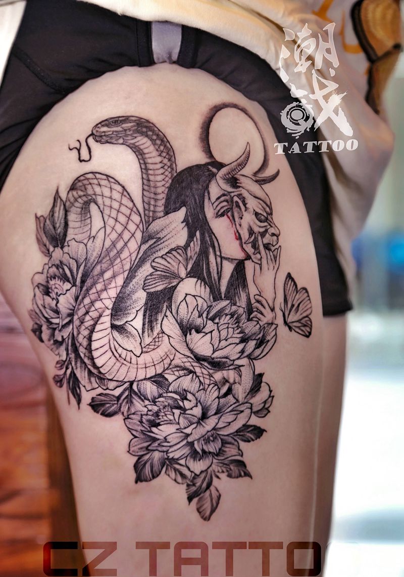当前位置: 首页 >上海市纹身店-上海纹身潮战TATTOO纹身图案>美女蛇纹身图片_腿部点刺欧美写实艺妓纹身图案