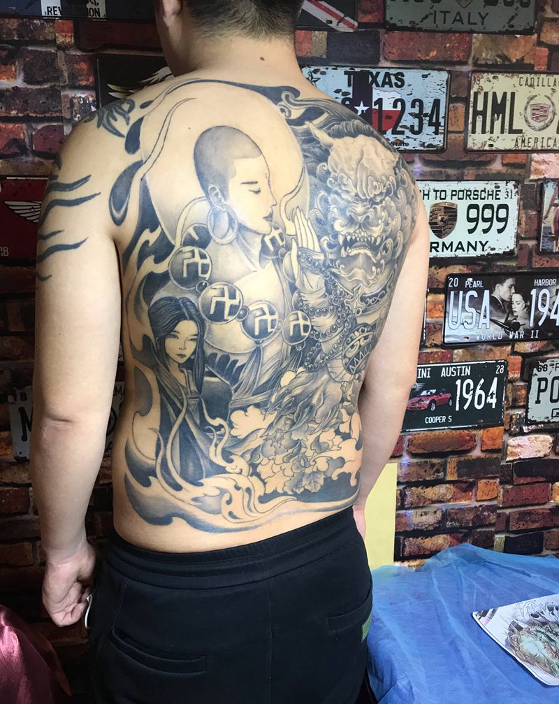 满背达摩唐狮纹身图片_背部新传统纹身图案