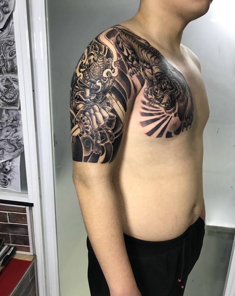 当前位置: 首页 >黑龙江省牡丹江市纹身店-名绣堂纹身纹身图案>鬼武士与虎半甲纹身图片