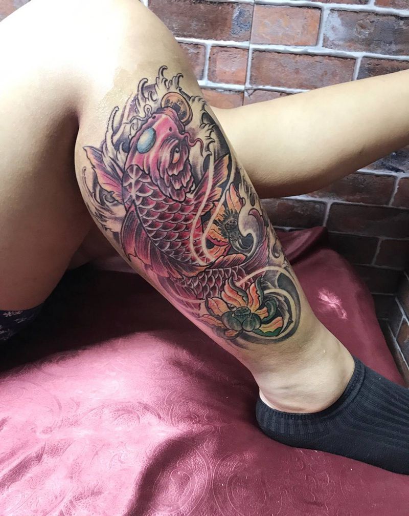 当前位置: 首页 >黑龙江省牡丹江市纹身店-名绣堂纹身纹身图案>小腿彩色鲤鱼纹身图片