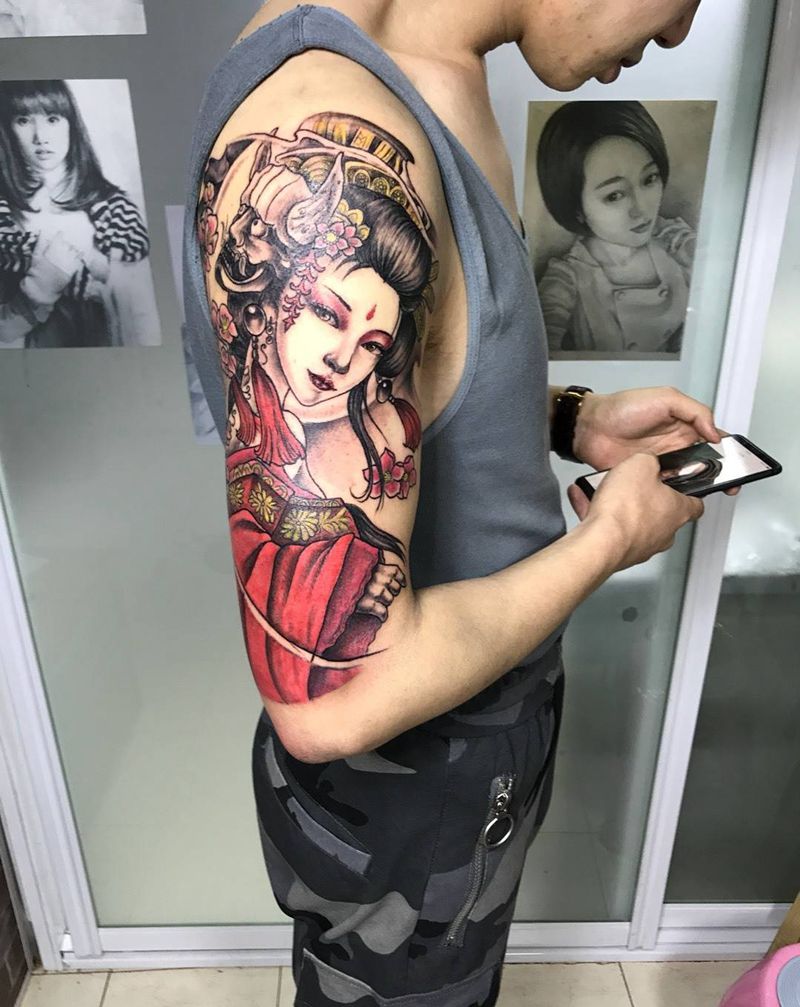 当前位置: 首页 >黑龙江省牡丹江市纹身店-名绣堂纹身纹身图案>彩色艺妓,顾客喜欢红色,所以红色纹身图片