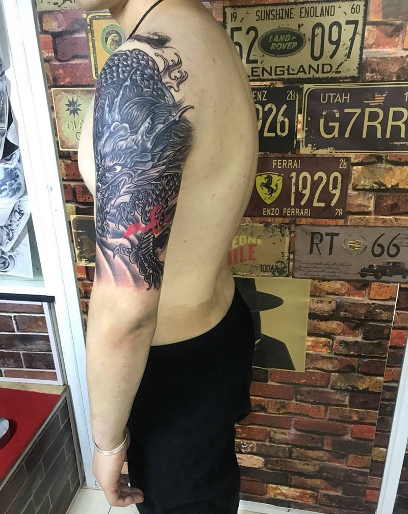• T网红王老大花腿龙纹身图片_腿部新传统纹身图案