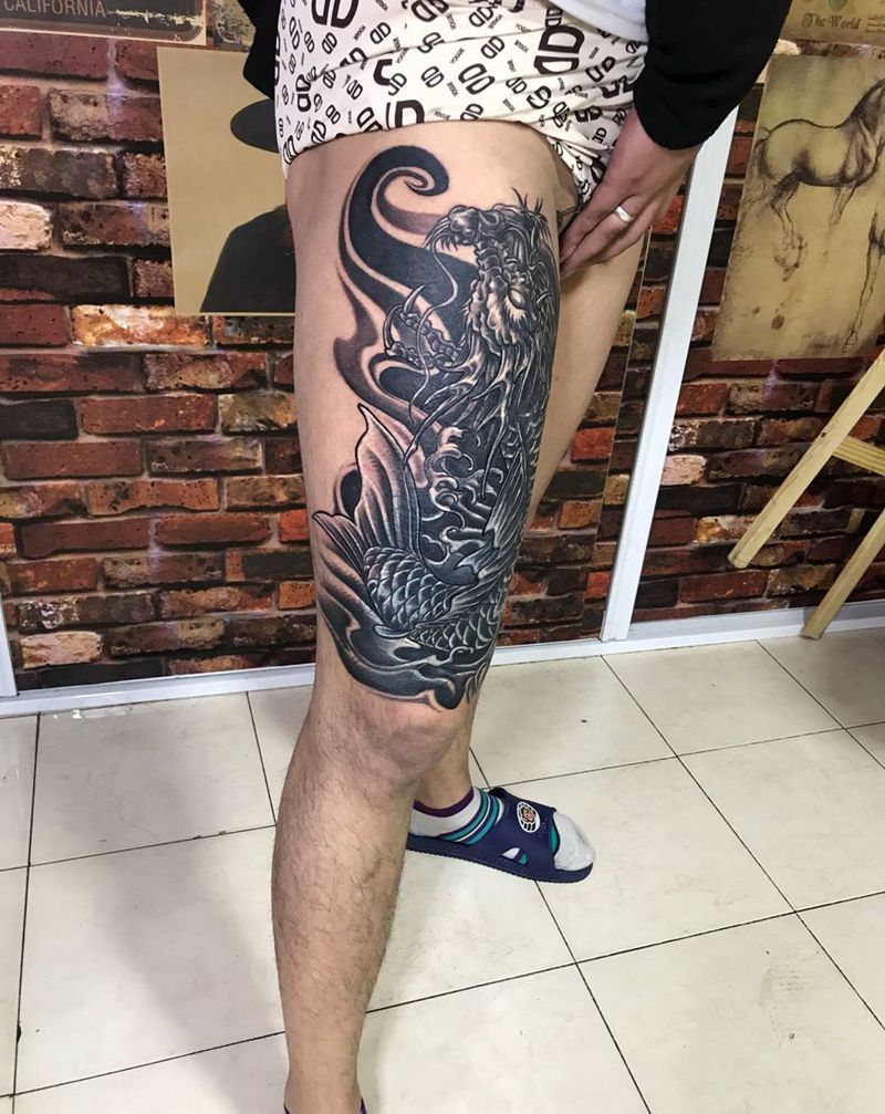 • T网红王老大花腿龙纹身图片_腿部新传统纹身图案