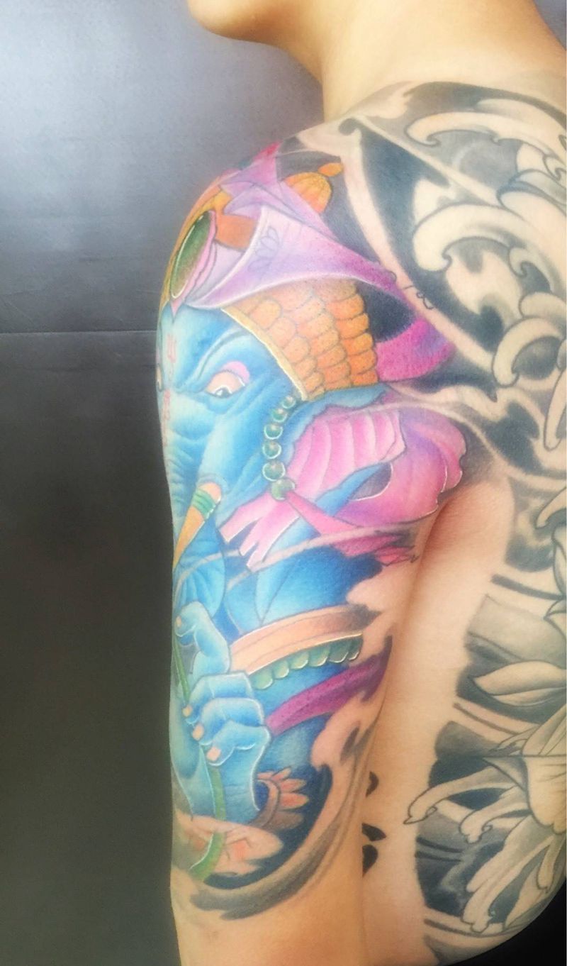 当前位置: 首页 >黑龙江省佳木斯市纹身店-双子纹身纹身图案>象财神半甲完成纹身图片