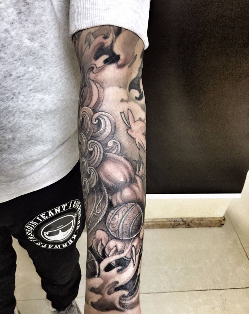 当前位置: 首页 >黑龙江省佳木斯市纹身店-双子纹身纹身图案>唐狮子包小臂完成。纹身图片