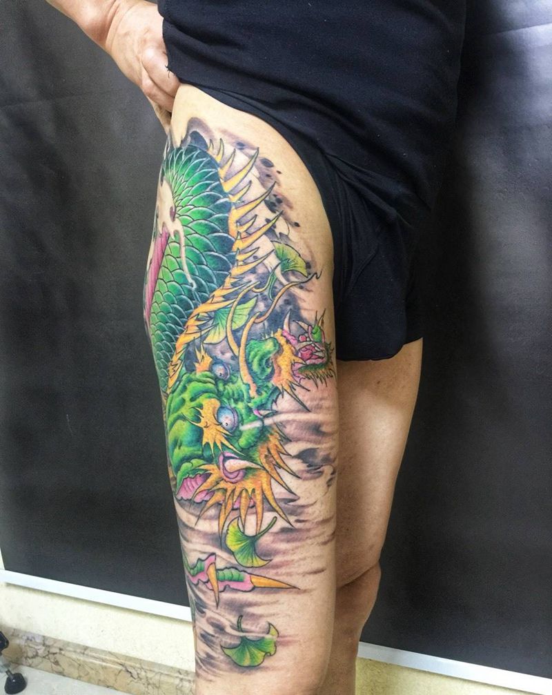 • T网红王老大花腿龙纹身图片_腿部新传统纹身图案