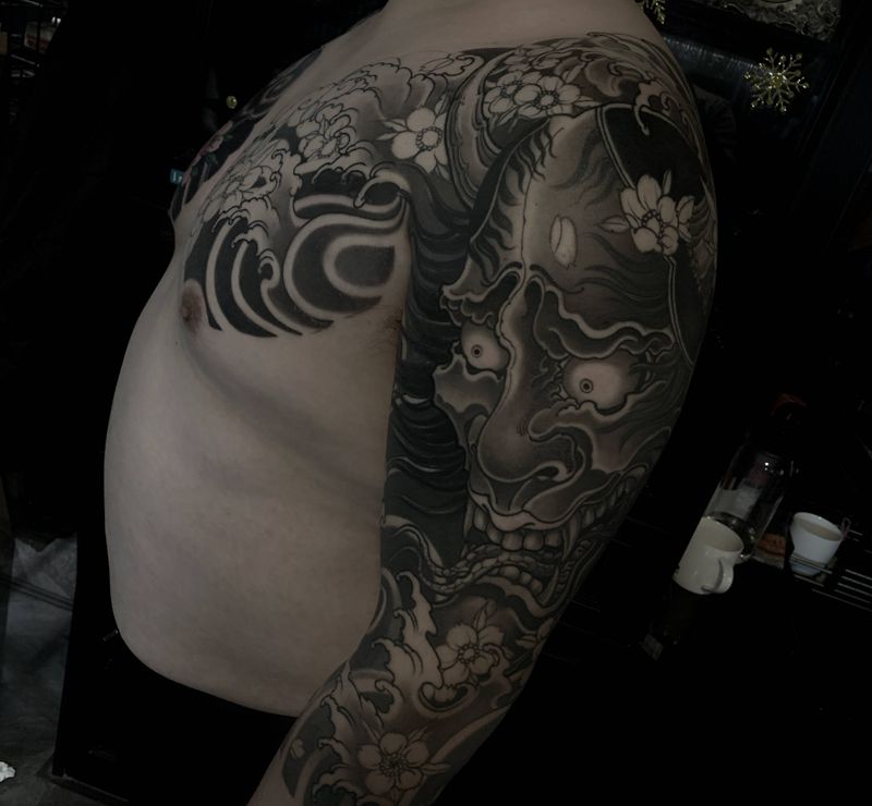 般若半甲七分袖纹身图片_肩部手臂新传统老传统纹身图案