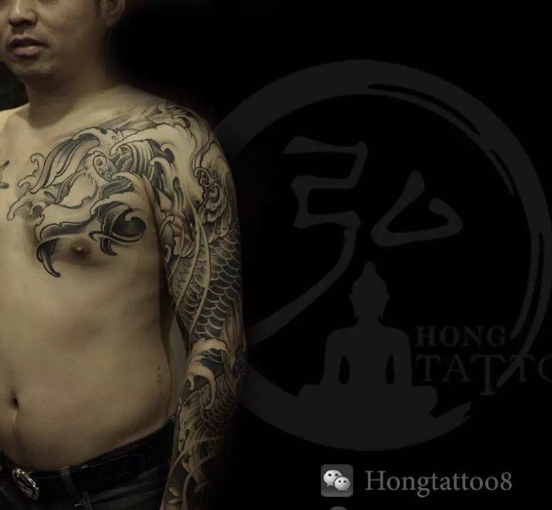 当前位置: 首页 >上海市纹身店-上海弘刺青纹身图案>黑灰鲤鱼花臂纹身图片