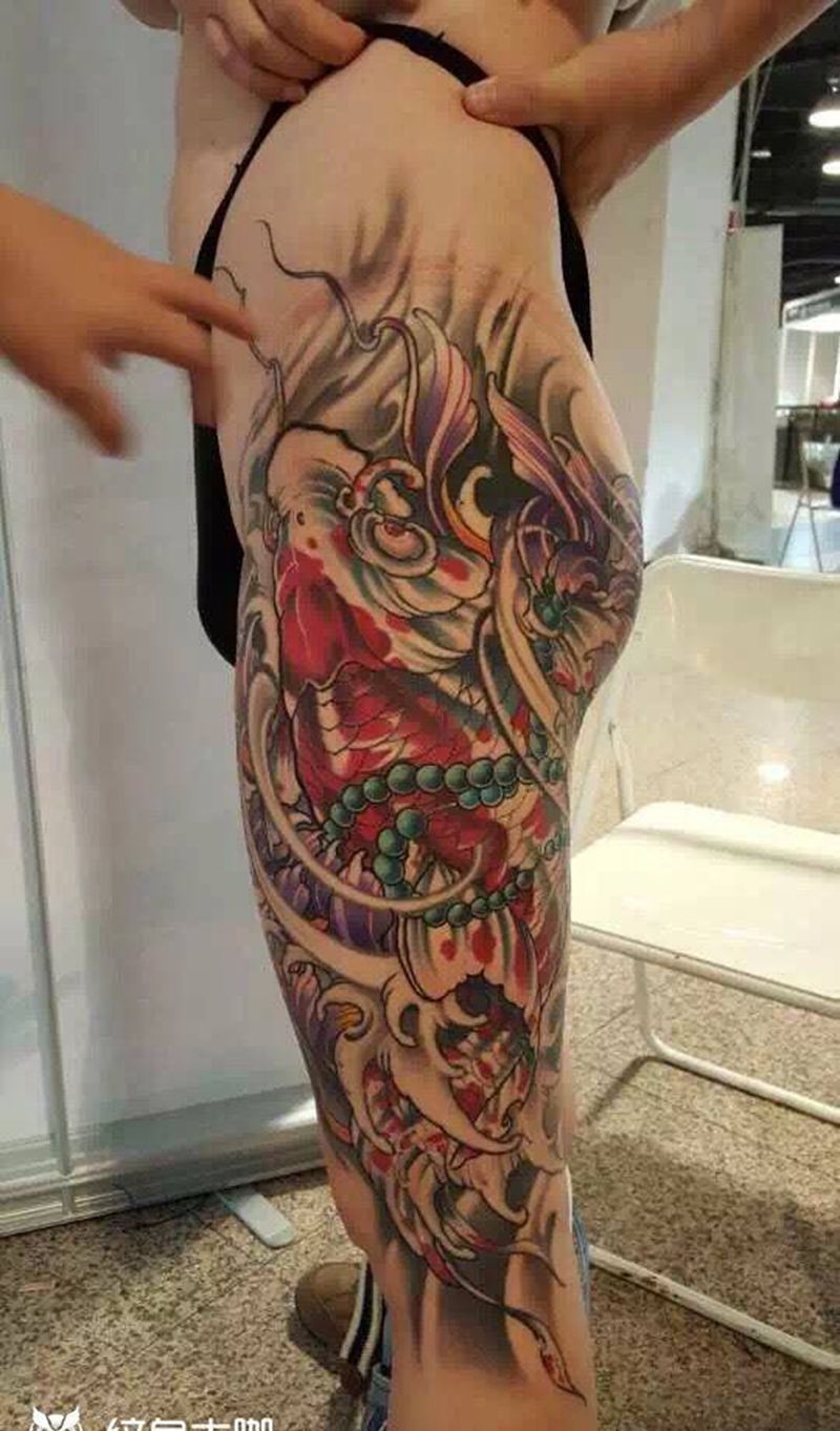 • T网红王老大花腿龙纹身图片_腿部新传统纹身图案