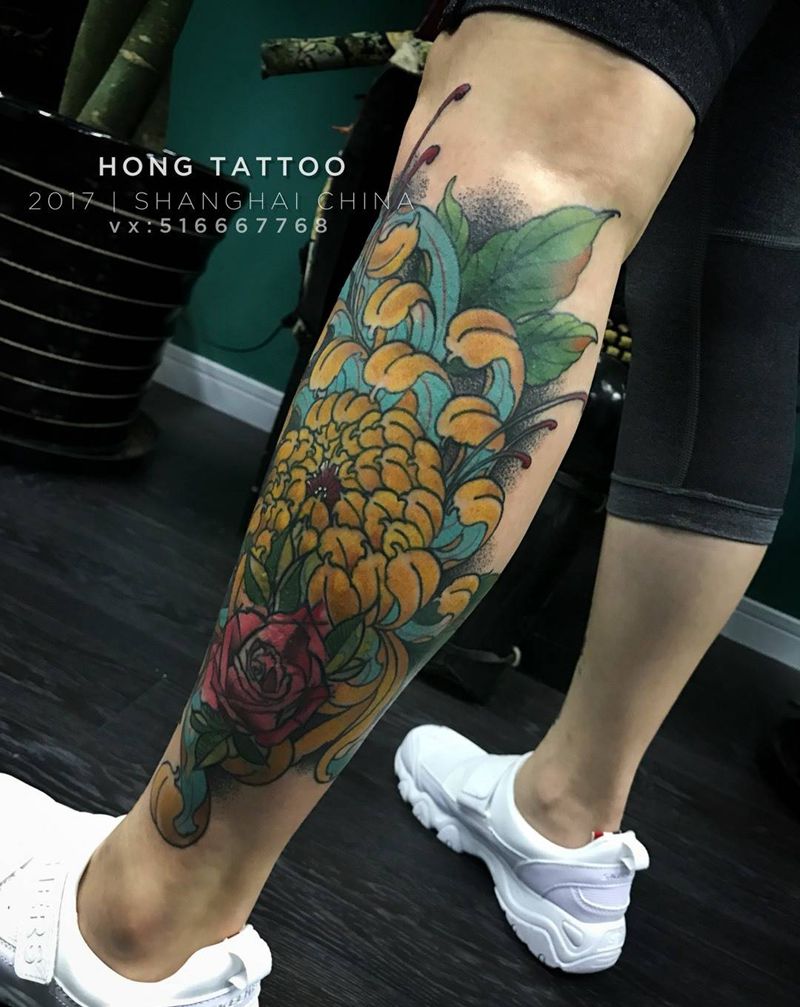 • T网红王老大花腿龙纹身图片_腿部新传统纹身图案