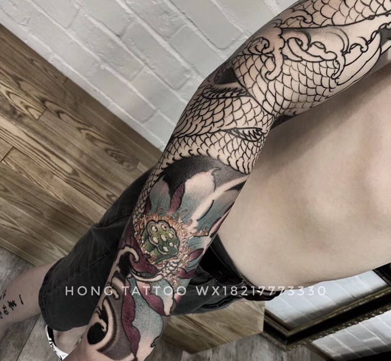 • T网红王老大花腿龙纹身图片_腿部新传统纹身图案