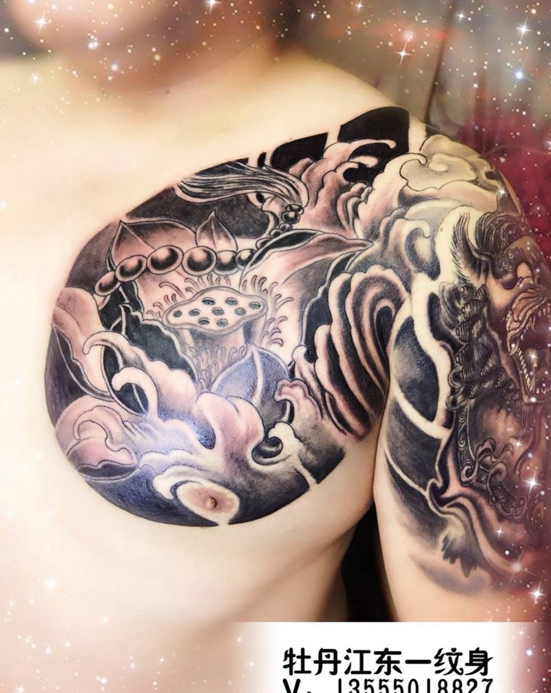 当前位置: 首页 >黑龙江省牡丹江市纹身店-牡丹江东一纹身馆纹身图案>唐狮荷花半甲纹身图片
