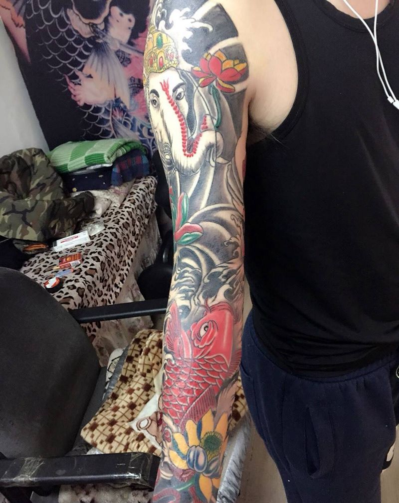 当前位置: 首页 >黑龙江省牡丹江市纹身店-牡丹江东一纹身馆纹身图案>彩色象神鲤鱼花臂纹身图片