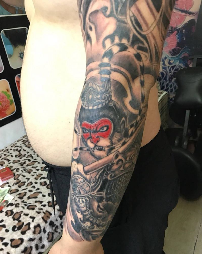 当前位置: 首页 >黑龙江省牡丹江市纹身店-牡丹江东一纹身馆纹身图案>二郎神孙悟空花臂纹身图片