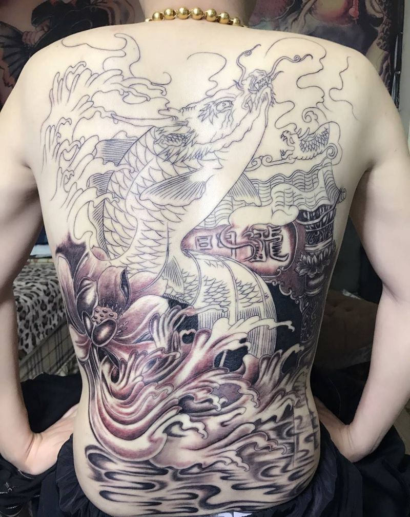 当前位置: 首页 >黑龙江省牡丹江市纹身店-牡丹江东一纹身馆纹身图案>满背鲤鱼跃龙门纹身图片
