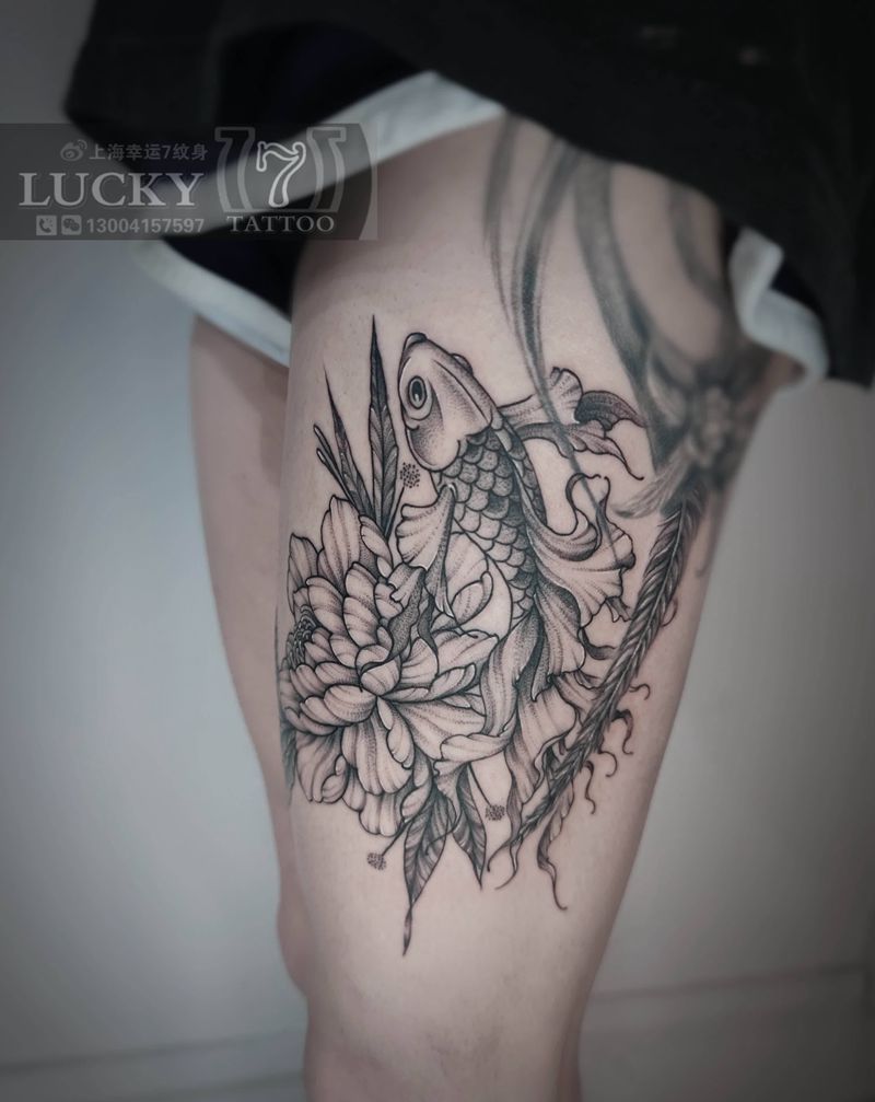 金鱼素花|幸运7纹身纹身图片_大腿清新纹身图案