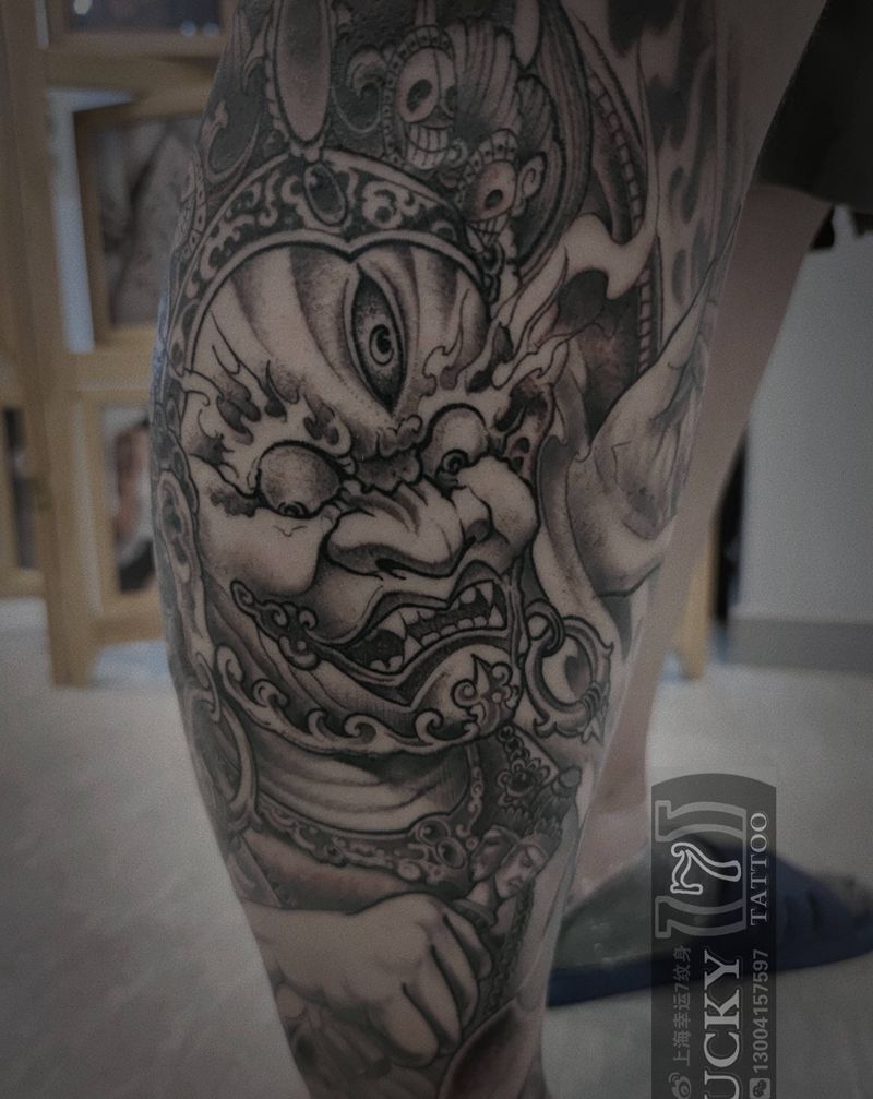 当前位置: 首页 >上海市纹身店-幸运7纹身Lucky7tattoo纹身图案>大黑天|幸运7纹身纹身图片_新传统小腿纹身图案
