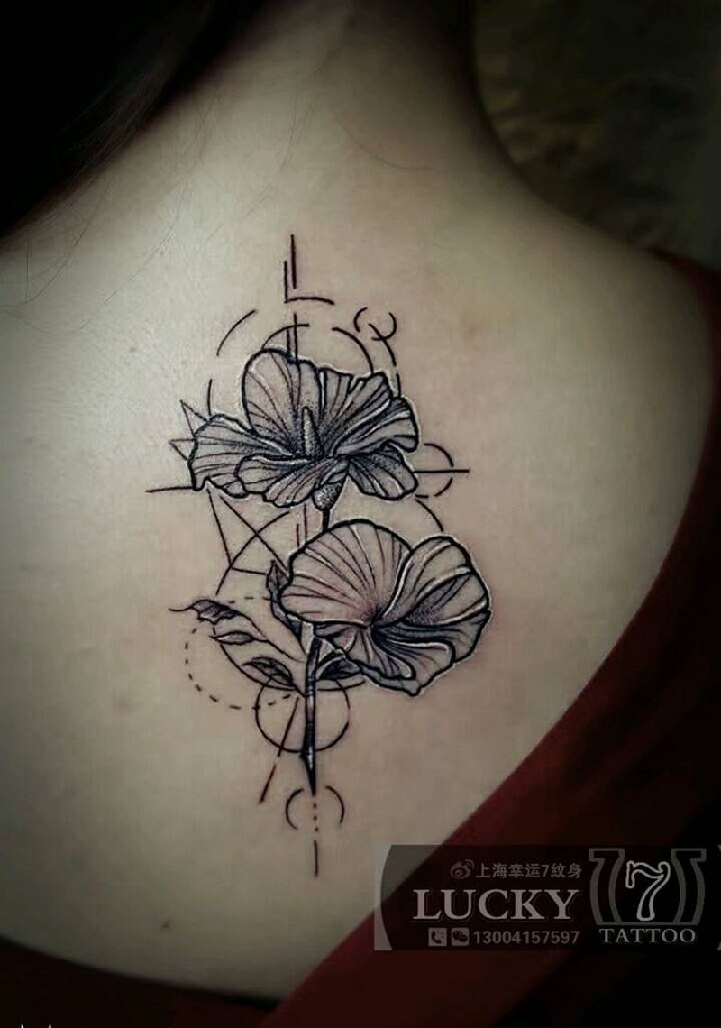点刺|花卉|幸运7纹身纹身图片_背部清新植物原创点刺成品纹身图案