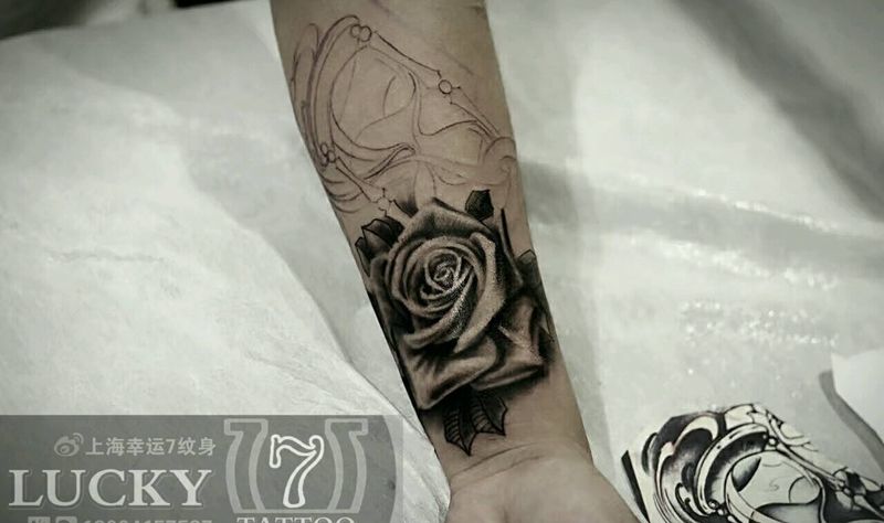未完成|玫瑰|幸运7纹身纹身图片_手臂写实植物原创黑灰未完成纹身图案