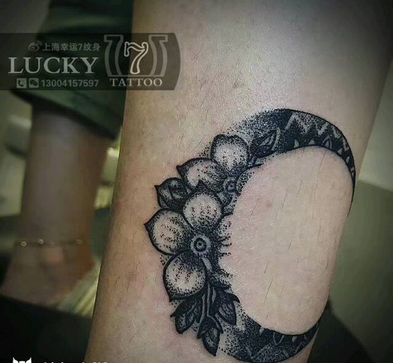 点刺|月牙|花卉|幸运7纹身纹身图片_腿部清新植物图腾点刺成品纹身图案