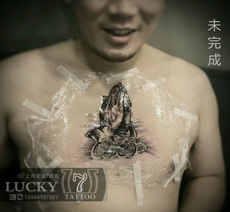 祈祷之手|奇卡诺|幸运7纹身纹身图片_胸部欧美黑灰成品纹身图案