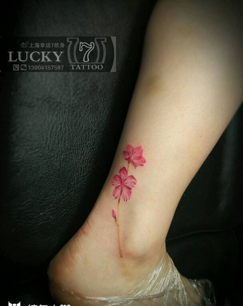 小花|幸运7纹身纹身图片_腿部清新植物彩色成品纹身图案