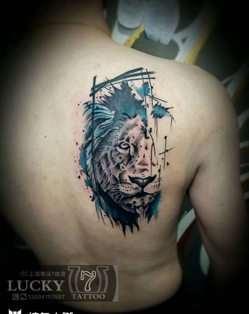 泼墨|狮头|幸运7纹身纹身图片_背部动物彩色水墨成品纹身图案