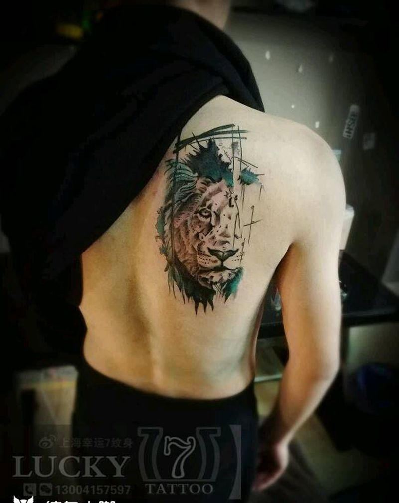 泼墨|狮头|幸运7纹身纹身图片_背部动物彩色水墨成品纹身图案