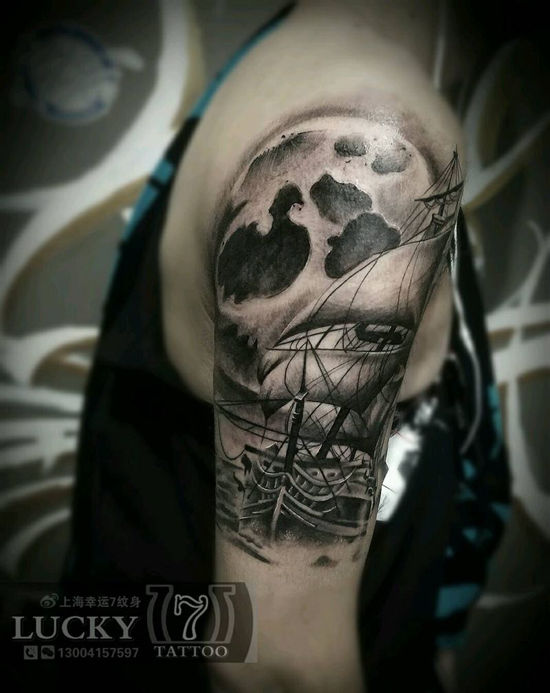 帆船|幸运7纹身纹身图片_手臂写实黑灰成品纹身图案