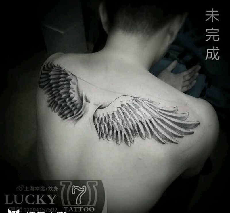 翅膀|幸运7纹身纹身图片_背部黑灰成品纹身图案