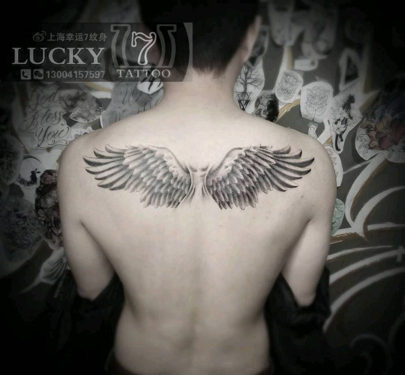 翅膀|幸运7纹身纹身图片_背部黑灰成品纹身图案