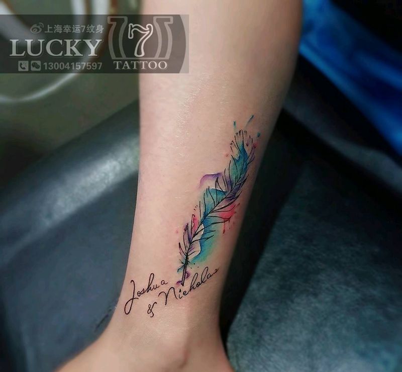 泼墨|羽毛|幸运7纹身纹身图片_腿部清新原创水墨成品纹身图案