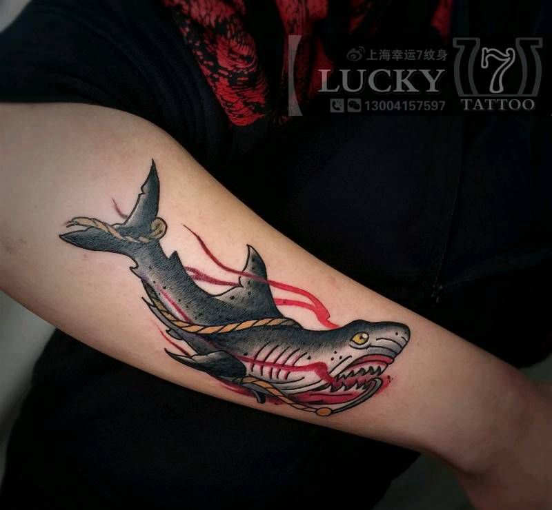 欧美|彩色|鲨鱼|幸运7纹身纹身图片_手臂欧美动物彩色成品纹身图案
