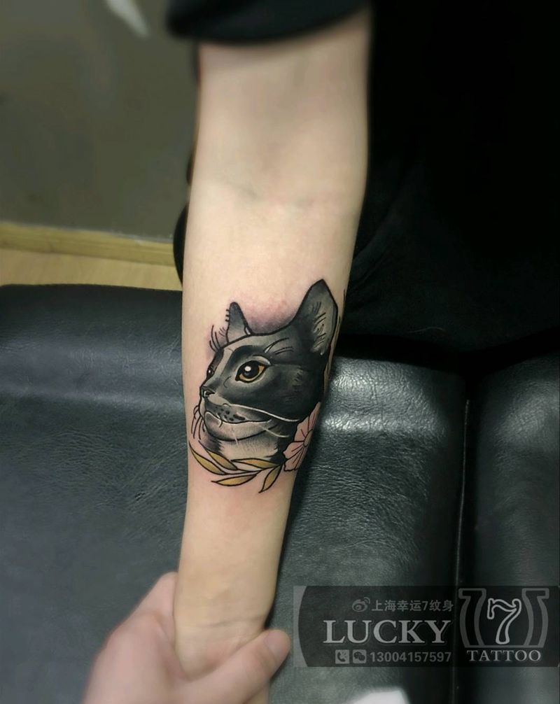 写实|彩色|猫头像|幸运7纹身纹身图片_手臂肖像写实动物成品纹身图案