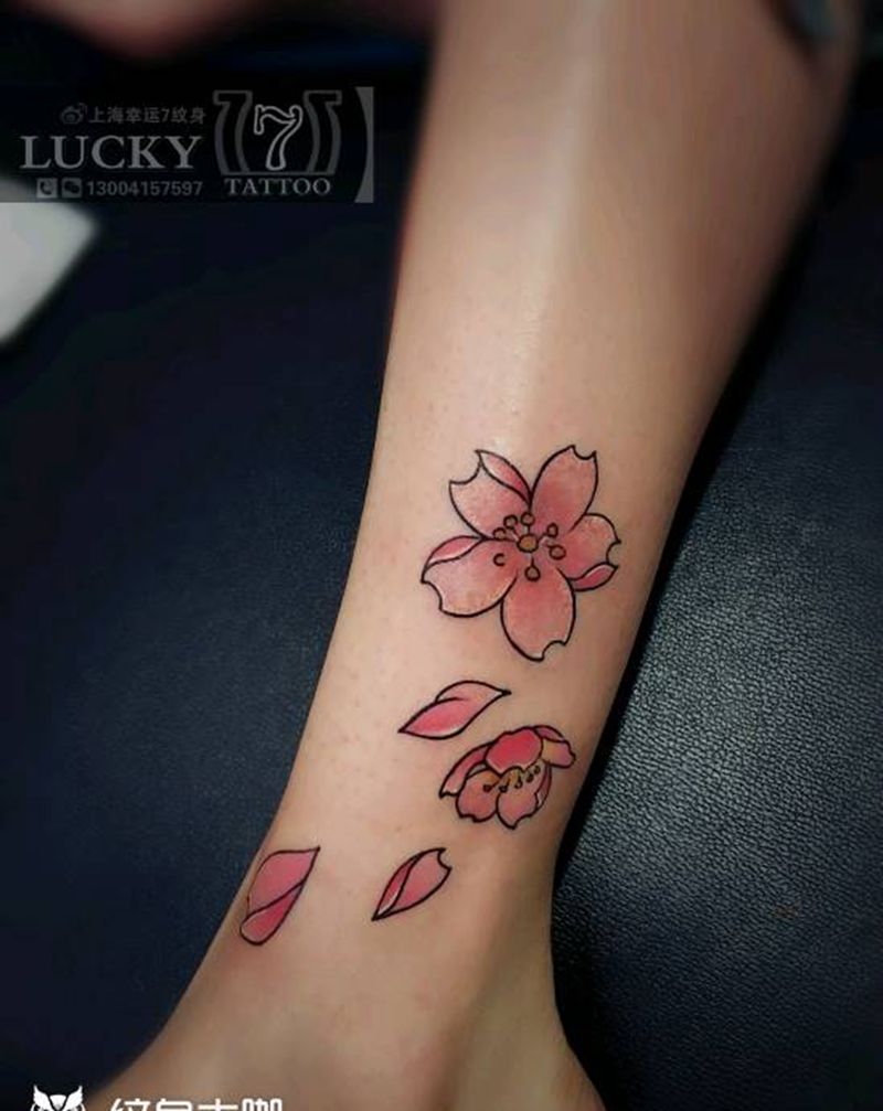 盖疤|樱花|幸运7纹身纹身图片_腿部清新植物盖疤成品纹身图案