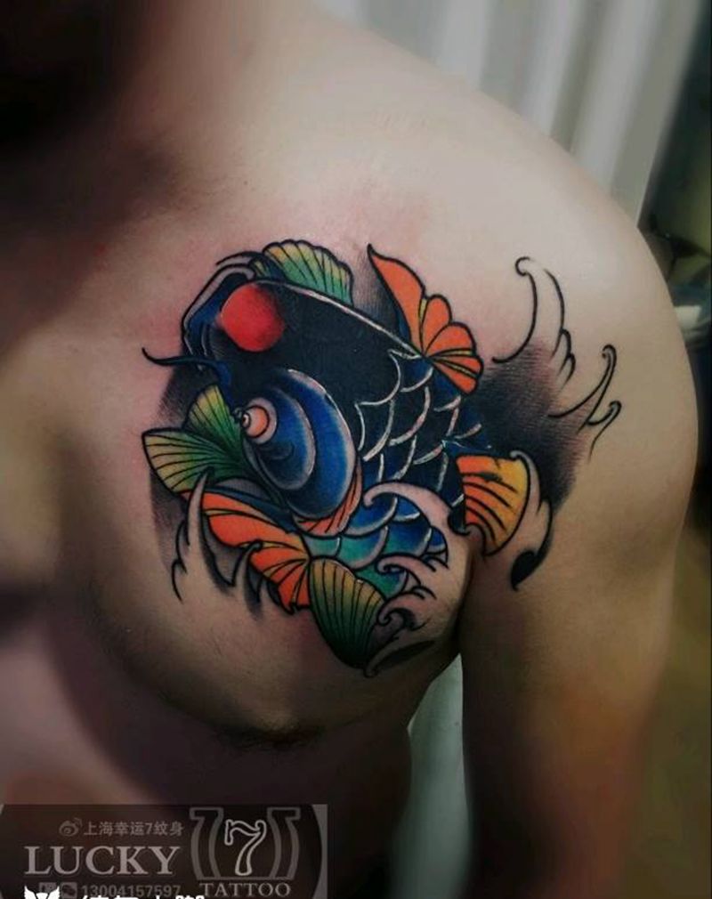 遮盖修改|传统鲤鱼|幸运7纹身纹身图片_胸部传统遮盖修改彩色成品纹身图案