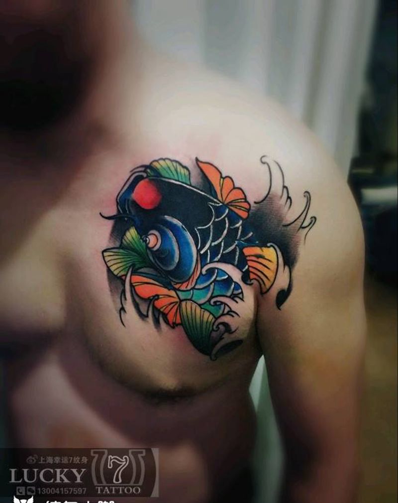 遮盖修改|传统鲤鱼|幸运7纹身纹身图片_胸部传统遮盖修改彩色成品纹身图案