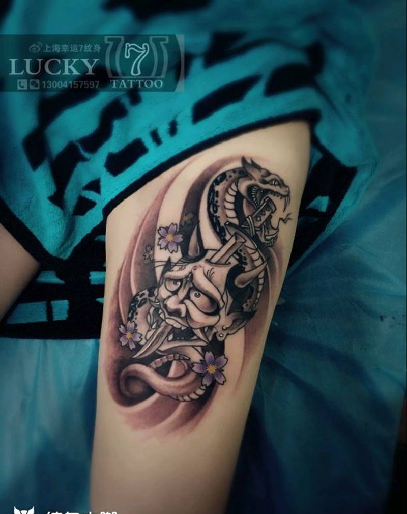 新传统|般若|幸运7纹身纹身图片_腿部传统鬼神成品纹身图案