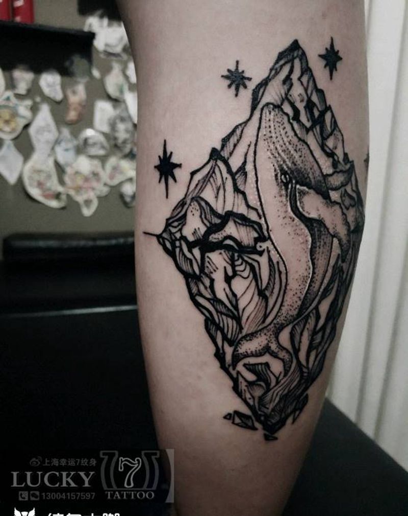 鲸鱼|点刺|幸运7纹身纹身图片_腿部清新动物点刺成品纹身图案