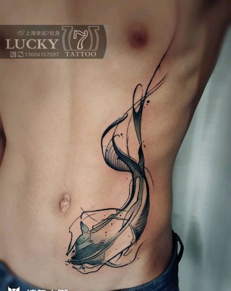 抽象泼墨|鱼纹身|幸运7纹身纹身图片_腹部欧美泼墨成品纹身图案