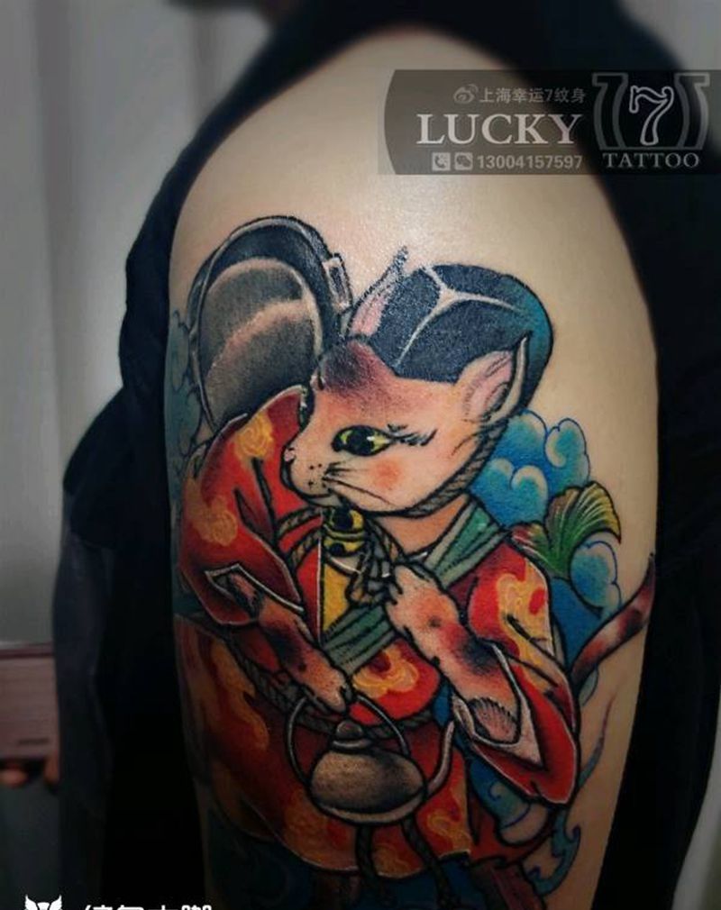 咖啡|猫|幸运7纹身纹身图片_手部欧美原创彩色成品纹身图案