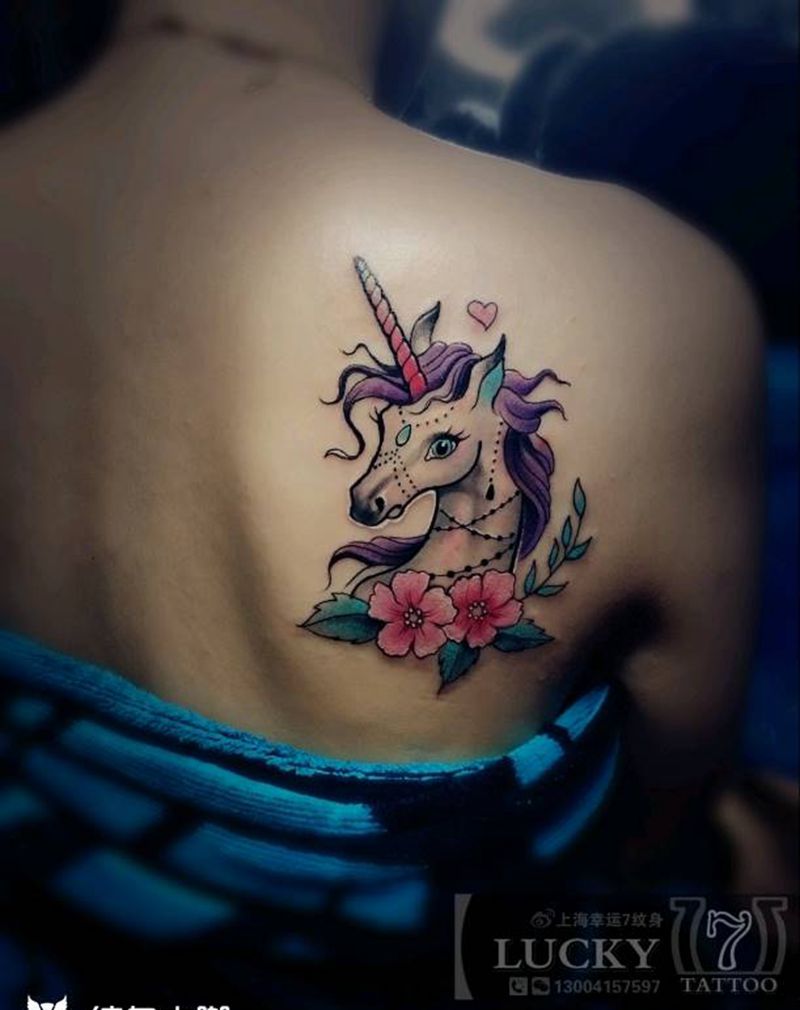 独角兽|幸运7纹身纹身图片_背部清新动物彩色成品纹身图案