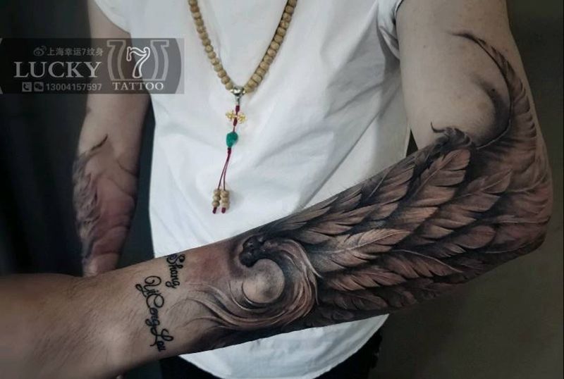 黑灰写实|翅膀|幸运7纹身纹身图片_手臂欧美写实黑灰成品纹身图案