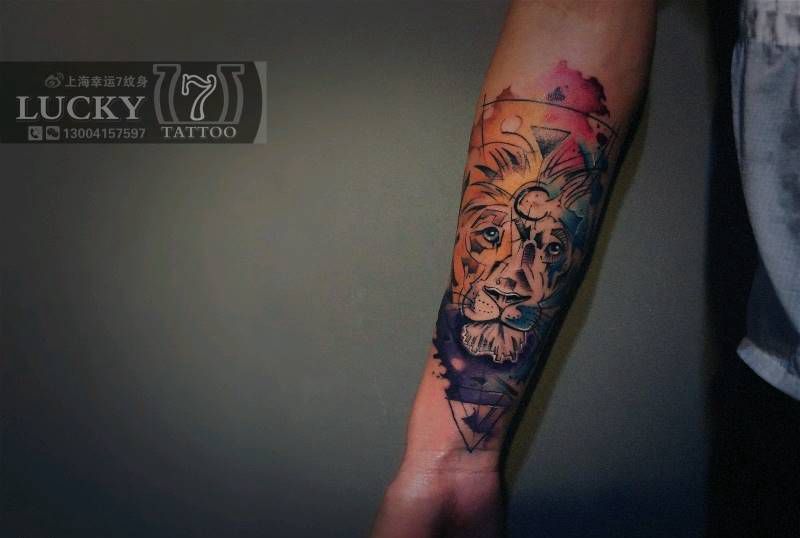 泼墨|狮头|幸运7纹身纹身图片_手臂动物彩色泼墨成品纹身图案