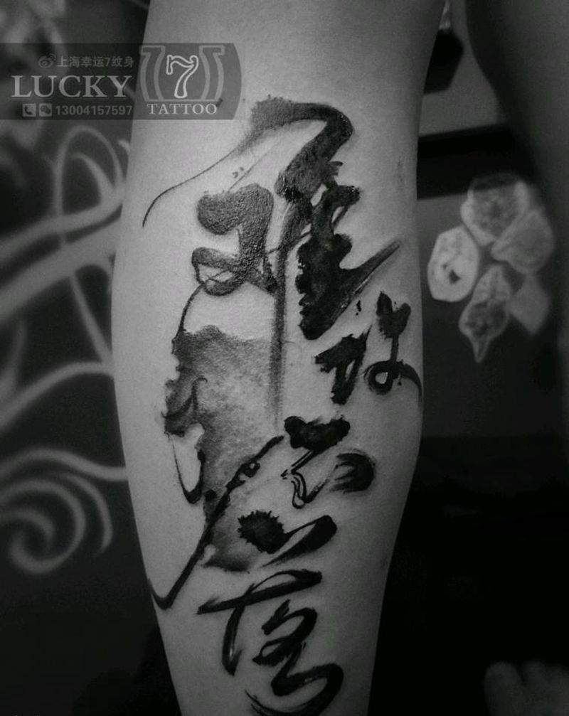 书法汉字|幸运7纹身纹身图片_腿部水墨书法纹身图案