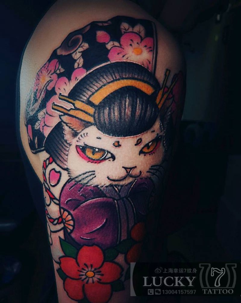 艺妓招财猫|幸运7纹身纹身图片_手臂New School纹身图案
