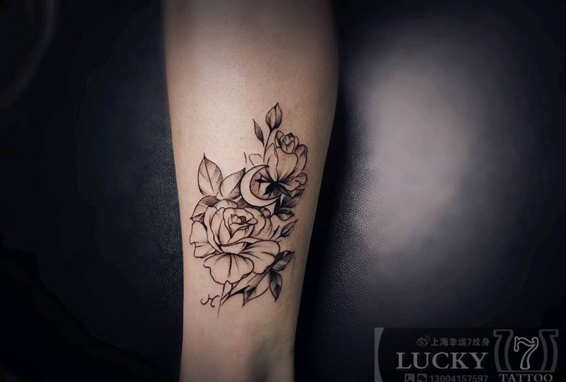 小清新|玫瑰|幸运7纹身纹身图片_腿部小清新纹身图案